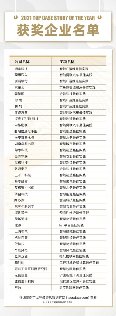 2022年1月20日,北京涛思数据科技有限公司(TAOS Data) 正式公布TDengine 2021年度最佳案例奖,共评选出包括顺丰科技、理想汽车、京东云、同花顺、得物、转转、零跑汽车、跨越速运等36个获奖案例,囊括了金融、物流、汽车、电商、智慧能源、智慧农业在内的多个行业。